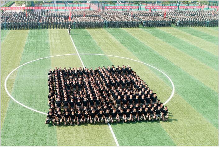 2018级新生军训汇报演出时摆出65造型庆祝公司65周年华诞