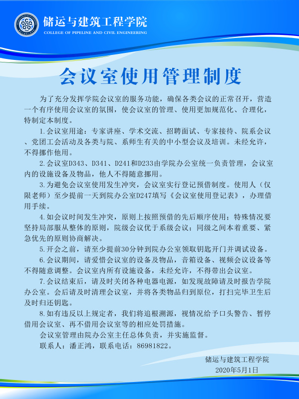 1.会议室用途:专家讲座、学术交流、招聘面试、专家接待、院系会议、工作组会议、党团工会活动及各类与院、系师生有关的中小型会议及培训。未经允许,不得挪作他用。