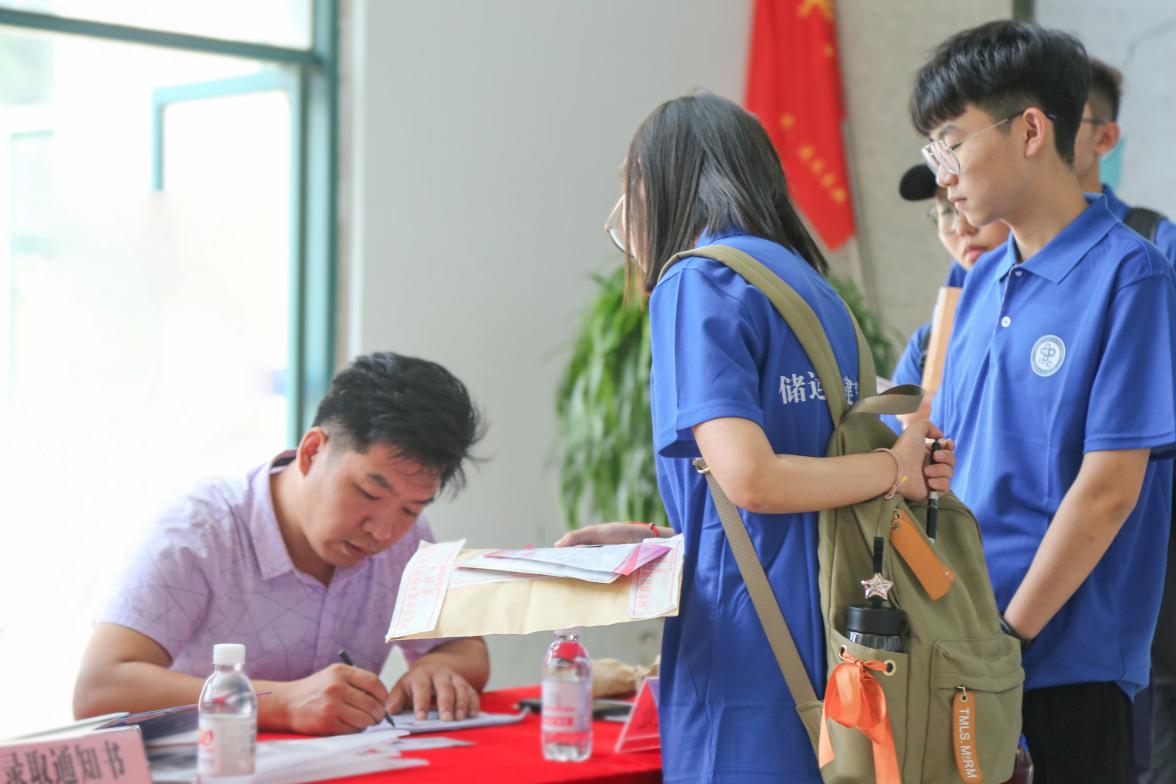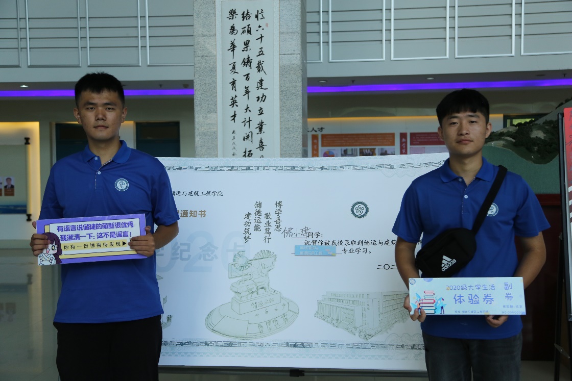 新生站在“录取通知书”纪念板旁拍照留念