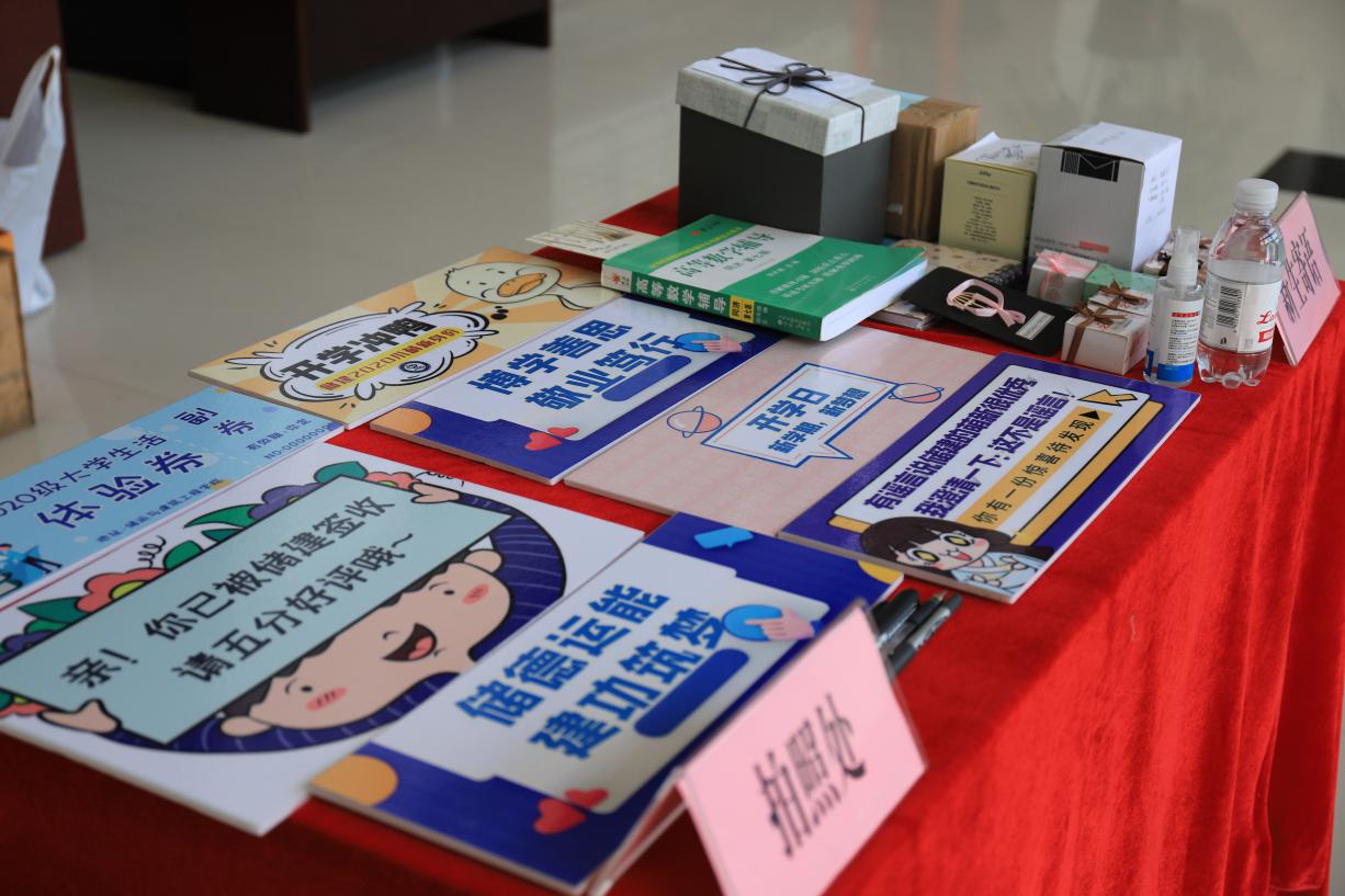 (新生拍照纪念点手卡和2019级员工为他们准备的礼物和信件 徐子棋摄)