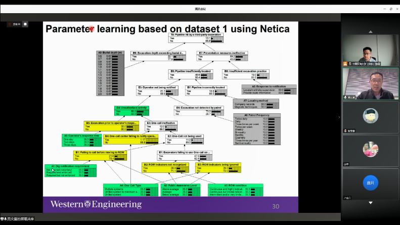 本次《贝叶斯网络在油气管道完整性管理中的应用》讲座的成功举办,为同学和老师们提供了一个与加拿大行业专家近距离交流的机会,讲座内容非常贴合同学们的研究内容和油气储运行业的发展需求,有益于大家开拓思路,开展进一步的合作交流。公司在疫情期间,积极开拓新的学术交流方式和渠道,并使之成为常态化,不仅最大程度上减小了全球疫情对学术交流的影响 ,还为今后的合作交流开创了更加便捷高效的新模式。