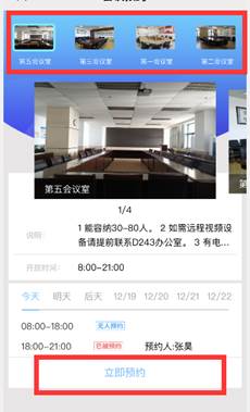 3. 首先找到需要借用的会议室,选择计划开会日期,即可查看当日预约情况,若时间合适,点击“立即预约”完善信息。