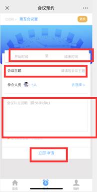 4. 依次填写“借用时间”、“会议主题”、“参会人员”和“会议事项说明”,其中“参会人员”为可选项,选择后系统会自动发送消息提醒参会人,“会议事项说明”中需填写借用人的联系方式,最后点击“立即申请”提交申请。