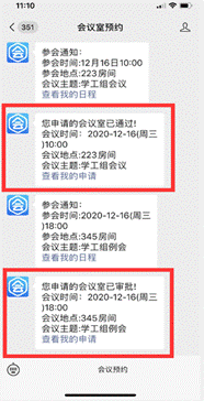 6. 申请通过与否,有反馈信息提示。除第五会议室(D345)房间需要审批人审批外,其他会议室自动审批。