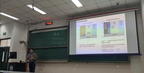 报告中,蒋晗教授对柔性材料与刚性基底粘接界面剪切破坏的力学原理进行讲解,同时说明了柔性材料“软”特性引入界面剪切失效问题的复杂性,结合柔性材料复合层界面剪切失效的特殊性,考虑柔性材料非线性、率相关、蠕变松弛等特点,计算分析了粘弹性材料和刚体层合结构界面剪切失效,并给出了相应的相图。同时,蒋教授就实验过程中发现的层合界面分子链的热激活断裂使得界面失效显著的率相关问题做了深入探讨,认为应变速率也可能会造成界面的延迟失效。最后,蒋教授对这一领域的未来研究走向进行了展望。