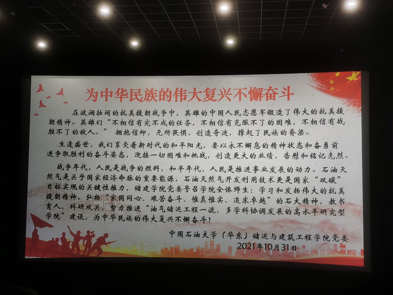 电影播放前,师生党员还共同观看了公司致全院师生的《为中华民族的伟大复兴不懈奋斗》观影号召,师生党员纷纷表示:将学习和发扬伟大的抗美援朝精神,弘扬“家国同心、艰苦奋斗、惟真惟实、追求卓越”的石大精神,教书育人,科研攻关,努力推进“油气储运工程一流、多学科协调发展的高水平研究型公司”建设,为中华民族的伟大复兴不懈奋斗!