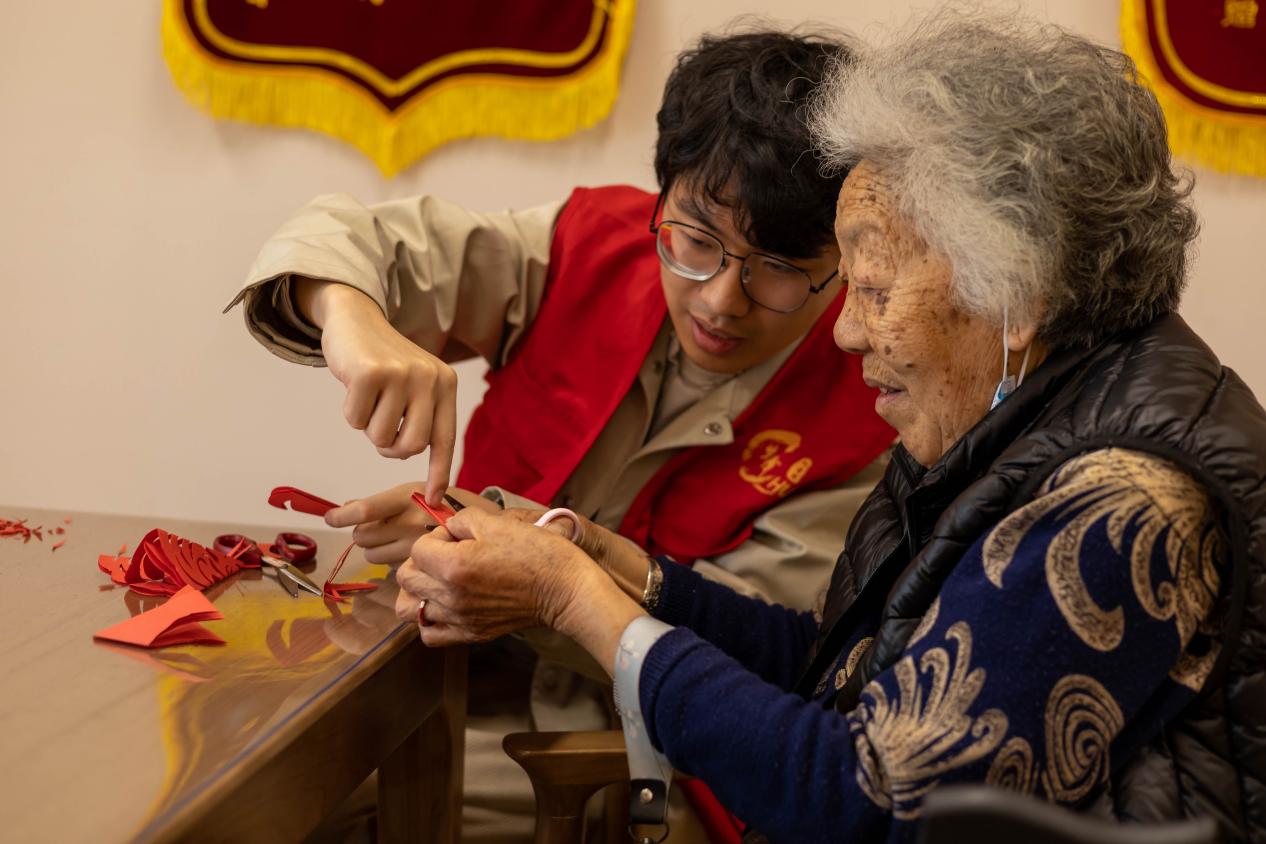 在召旭服务队活动负责人李琳美和建筑2102团支部书记高涵的带领下,志愿者们坐地铁抵达岛西海岸新区薛家岛长者生活照顾之家。抵达敬老院时,恰逢老人们晨间活动,全体成员在敬老院工作人员的指导下搀扶老人抵达一楼活动空间。随后,志愿者们在活动室和老人们一起剪窗花、聊天,并将所有窗花送给老人们,祝愿他们身体健康、万事顺遂。部分志愿者在工作人员的帮助下与老人们一起做晨间操,一起唱歌,建筑2102班魏欣琪为老人们准备了唱歌节目《我和我的祖国》。在志愿服务中,老人们与敬老院工作人员们对于志愿者们的到来感到无比温暖与开心,全体志愿者深刻体会到了雷锋同志的无私奉献、助人为乐的精神。