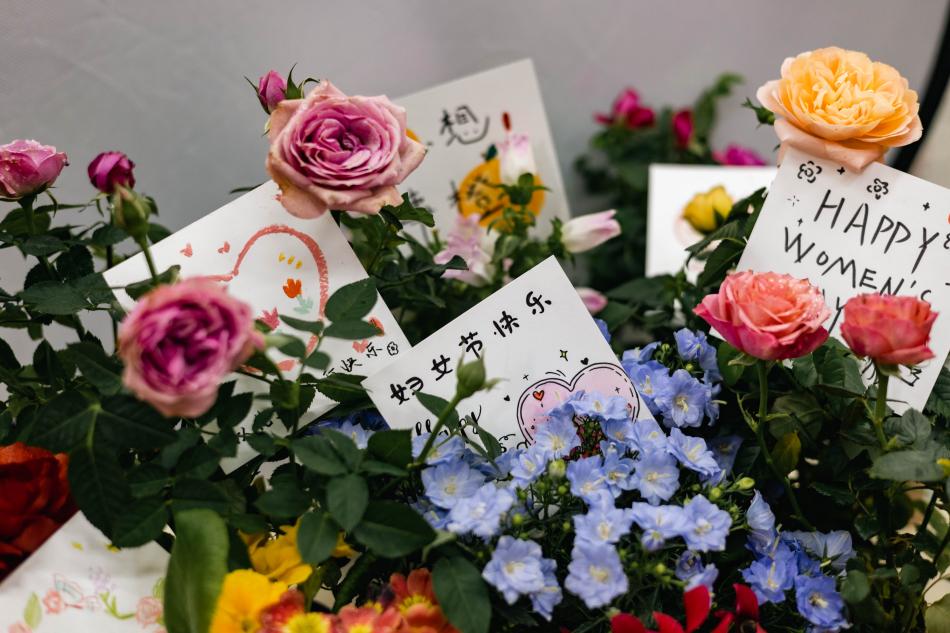 烟花三月,春华已开颜,弄花香满衣。在这春暖花开的日子里,我们迎来了一年一度的“三八”国际妇女节。为了庆祝这一节日,向辛苦工作的女性劳动者们表达问候和祝福,储建召旭服务队准备了鲜花与贺卡,于3月8日下午四点在本科生宿舍楼区域开展了“以花之名,感她之勤”的志愿活动。