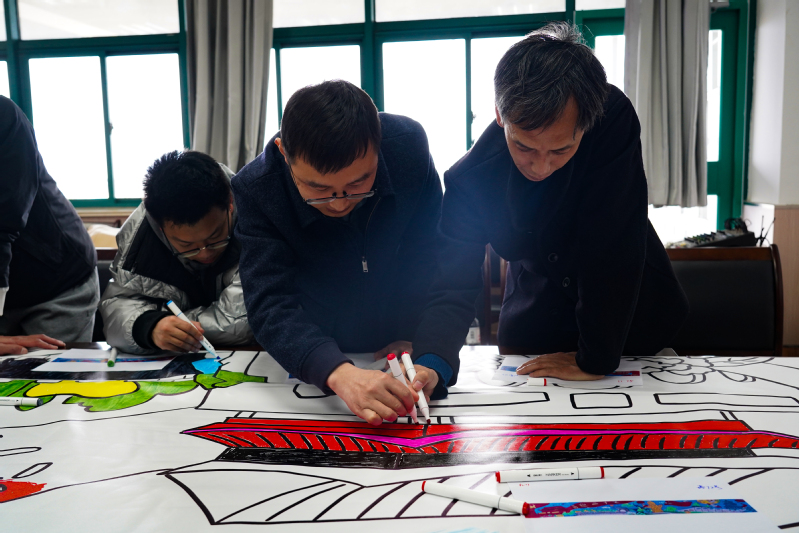 陈文军与李勇互致感谢,希望双方进一步强化交流,围绕毕业生招聘、党建团建共建等领域探索拓展校企合作的新渠道、新形式,助力校企双方共赢发展。活动现场,师生员工以祖国大好河山、科技创新成就等元素为中心进行“接力”绘制,线条与色彩交融之中蕴含着对新时代的使命担当。绘制过程中,公司师生与公司代表分工合作,边绘边谈,充分交流,气氛活跃融洽。在大家的共同努力下,历时2小时,长10米,高1.5米的长卷画作顺利完成。无论是画作中熠熠生辉的党旗和庄严的天安门,连绵不绝的青山和巍峨的长城,还是领跑世界的中国高铁,手可摘星的美好愿景,都是党带领全国各族人民艰苦奋斗的历史缩影,展现了新时代中国的社会创造力和发展活力,也承载着广大党员和青年团员浓浓的爱国情怀。长卷绘制完成后,中建一局五公司山东分公司代表和公司师生共同携长卷进行了合影留念。