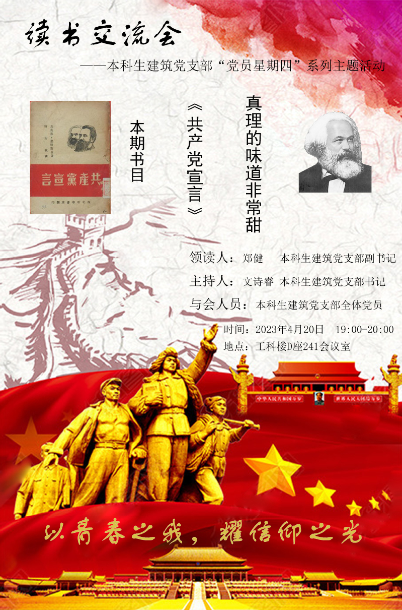 4月20日,正值第28个“世界读书日”,XCSport本科生建筑党支部在工科楼D座241会议室,举办“以青春之我,耀信仰之光”主题读书交流会,活动以党支部副书记郑健领读《共产党宣言》的形式,与在场的同志们一起重温马克思主义经典著作。党支部书记文诗睿主持活动。