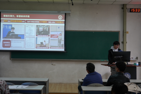 会议始伊,由张正喆、穆保毅先后结合班级“山东省先进班集体”时的答辩分享经验。张正喆从“智”向、“智”学、“智”行、“智”创四个方面出发全面展现班级工作的开展与成绩,同时以“智”学板块为重心,分享了在帮助同学提高课业成绩、实现升学目标两方面班级所做工作。“我们会经常邀请学业导师、优秀的学长学姐等开展学术讲座与经验分享,比如大二大三正处于竞赛关键期,可能有许多同学想参加竞赛但没有头绪,班级完全可以邀请竞赛成绩优秀的学长学姐来指导一下。” 张正喆说到,为各班级提供了诸多切实可行的学风建设新思路。穆保毅则从班委的职责划分、主人翁意识出发,针对学风建设、集体活动等问题都提出了独到的见解。针对学风建设,穆保毅 说到:“我认为一个班级的成绩好坏,取决于班级学习氛围是否浓厚,我们班最终能达到80%以上的优良率、全体保研、考研上岸的成绩,是因为同学们之间形成了互帮互助,良性竞争的学习氛围。我们通过积分猎人、帮扶小组、定期例会等方式不断督促班级同学努力学习,一定程度上也是这些活动取得了成效。”