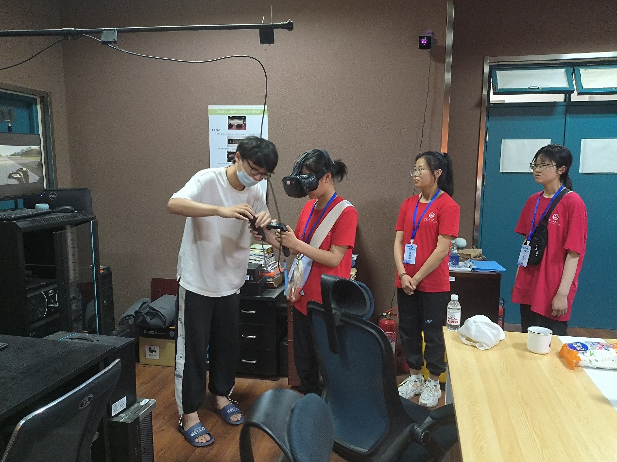 座谈会议结束,朱淑芳、王惠带领来访师生参观了建筑系建筑虚拟现实教学实验室,实验室负责人李佐龙老师对来自远方的客人表示欢迎,随后详细介绍了为五官村做的地标、村碑、站间等建筑物的设计理念,表示希望在五官村后续的发展建设中,助力形成具有当地特色的标志性建筑。后采用简洁明了的语言为三名中员工普及建筑学知识,建筑的美学,勉励员工勤奋好学,将来接触更加广阔的天地。最后,让三位中员工体验建筑系虚拟场景,身临其境,感受建筑与科技的融合。