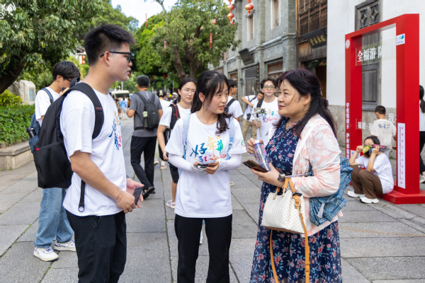 一路走来,实践队员遇到了来自上海、安徽、江苏、四川、福建等不同省份不同城市的游客,通过与游客的交流,实践队员广泛了解着不同游客来到三坊七巷所见所闻和所感,了解着古城的过去、现在和未来,思考着古城发展的难题和前景。实践队员走访发现,不同于部分古城道和商业街相融合的格局,为了更好地保护古城,三坊七巷的古城道和商业街相对分离,商户集中分布在南后街中,安静惬意的古城道与繁华热闹充满人间“烟火气”的商业街形成了鲜明的对比。“古代建筑与现代产业的碰撞,这就像是穿越千年的一场对话!”实践队员孙娜烨感慨万分。