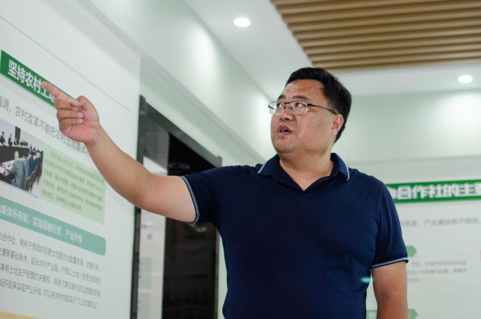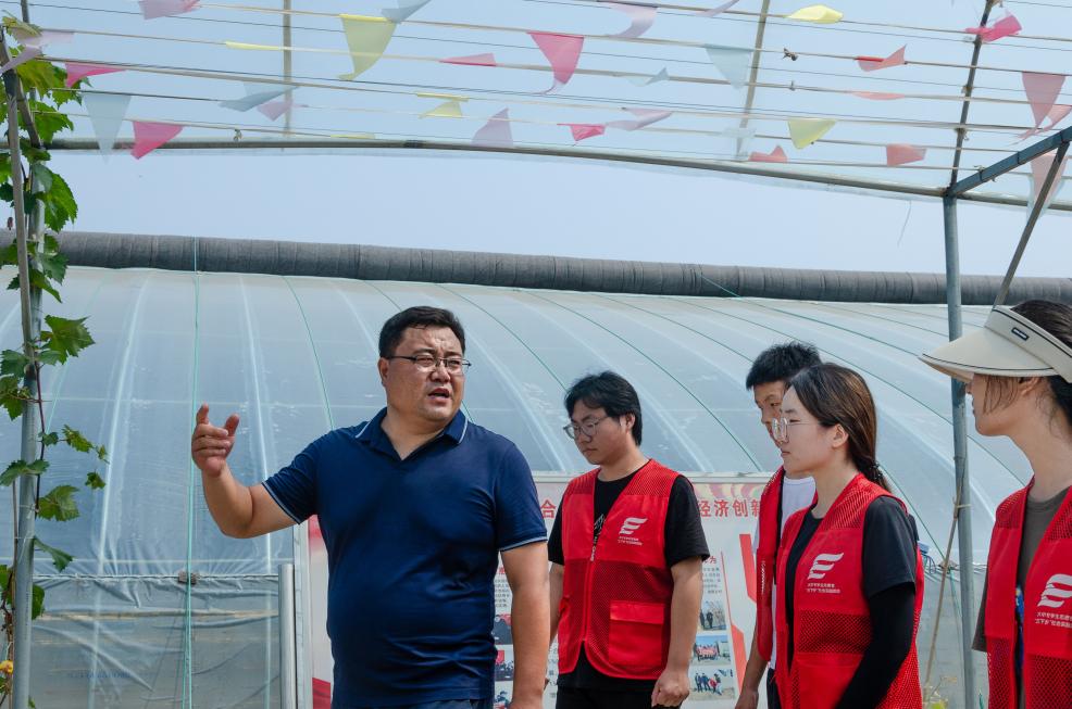 在河口村党支部书记吴业松的带领下,实践队成员参观学习了肥城市党支部领办合作社孵化中心,而后吴业松同李欣欣与实践队开展座谈,充分了解到以河口村为代表的老城街道为全力打造合作社规范化运行的示范样板,实现以组织振兴引领产业振兴,以产业振兴带动乡村振兴的良好格局。吴业松强调“当下以河口村为代表的多数老城村落都面临着人才紧缺的问题。人才是发展的第一资源,我们将不断推进产业建设与品牌设计,并进行宣传,以此来吸引、留住青年人才,为河口村的发展不断注入新的能量。”最后,吴业松带领实践队成员参观河口村的特色蔬果种植园,一览乡村振兴硕果,切实体会到河口村近年来深刻的发展变化。