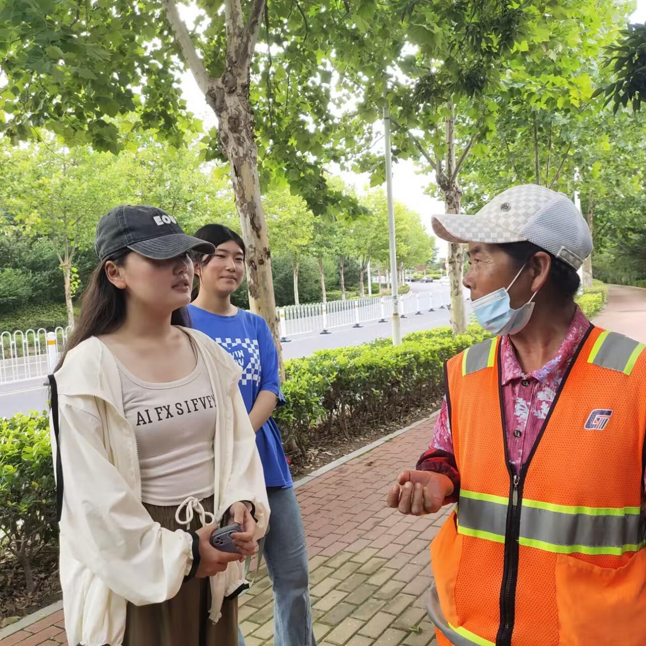 此外,实践队还采访了当地的环卫工人,经过与环卫工人的交流,实践队成员认识到了环卫工作的辛苦。并向环卫工人表达深深的敬意,随后还帮助环卫工人进行了部分街道的垃圾清理工作。