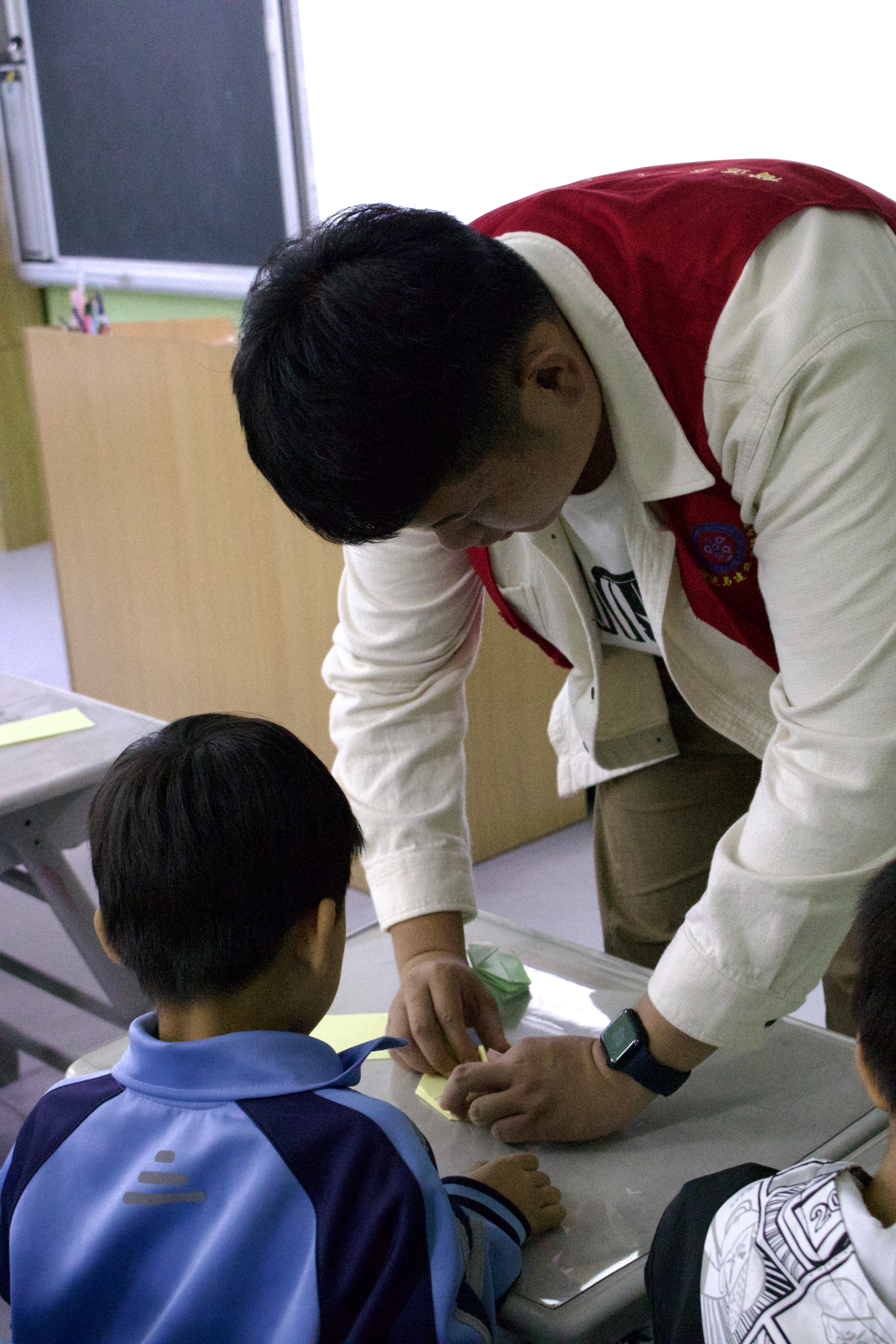 在活动现场,志愿者们向小朋友们分发先前准备好的丰富多样的折纸材料,同时,小朋友们分成小组,在互相协作中积极探索折纸的奥秘,尝试着将平面的纸张变成立体的艺术作品的乐趣。在探索的过程中出现问题时,小朋友们也会积极举手向志愿者提问以寻求帮助,而志愿者们也耐心地帮助有问题的小朋友解决问题,并时刻关注每位小朋友,以确保每个小朋友都参与到活动中来。在这个过程中,小朋友们不仅展示出活力与童真,收获笑容与知识,更锻炼了手和眼的协作能力,培养了耐心和团队合作的精神。