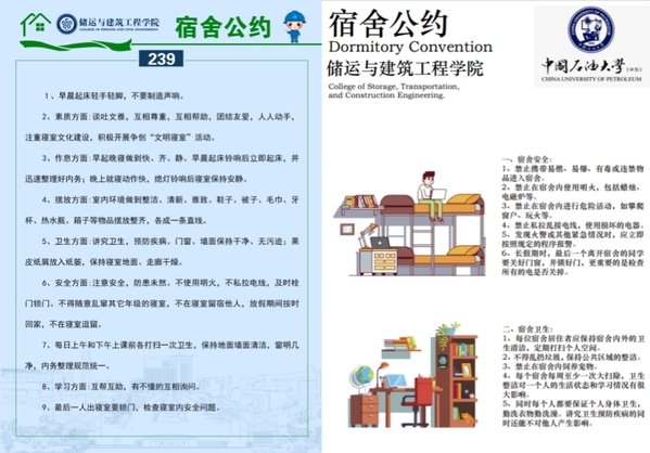 “创意宿舍公约”由宿舍全体成员共同制定,对宿舍集体来说更具说服力,易于被遵守,有利于共同约束力的形成,能有效增进宿舍感情,使宿舍成为彼此间温馨、可靠的港湾。以宿舍为单位开展“宿舍风采展示”作品征集,各宿舍充分发挥想象力、创造力,通过文章、组图、视频、实物等形式,展示独特的宿舍文化,其中征文《我和我的宿舍》获推参评山东省教育厅“公寓的故事”主题系列活动。