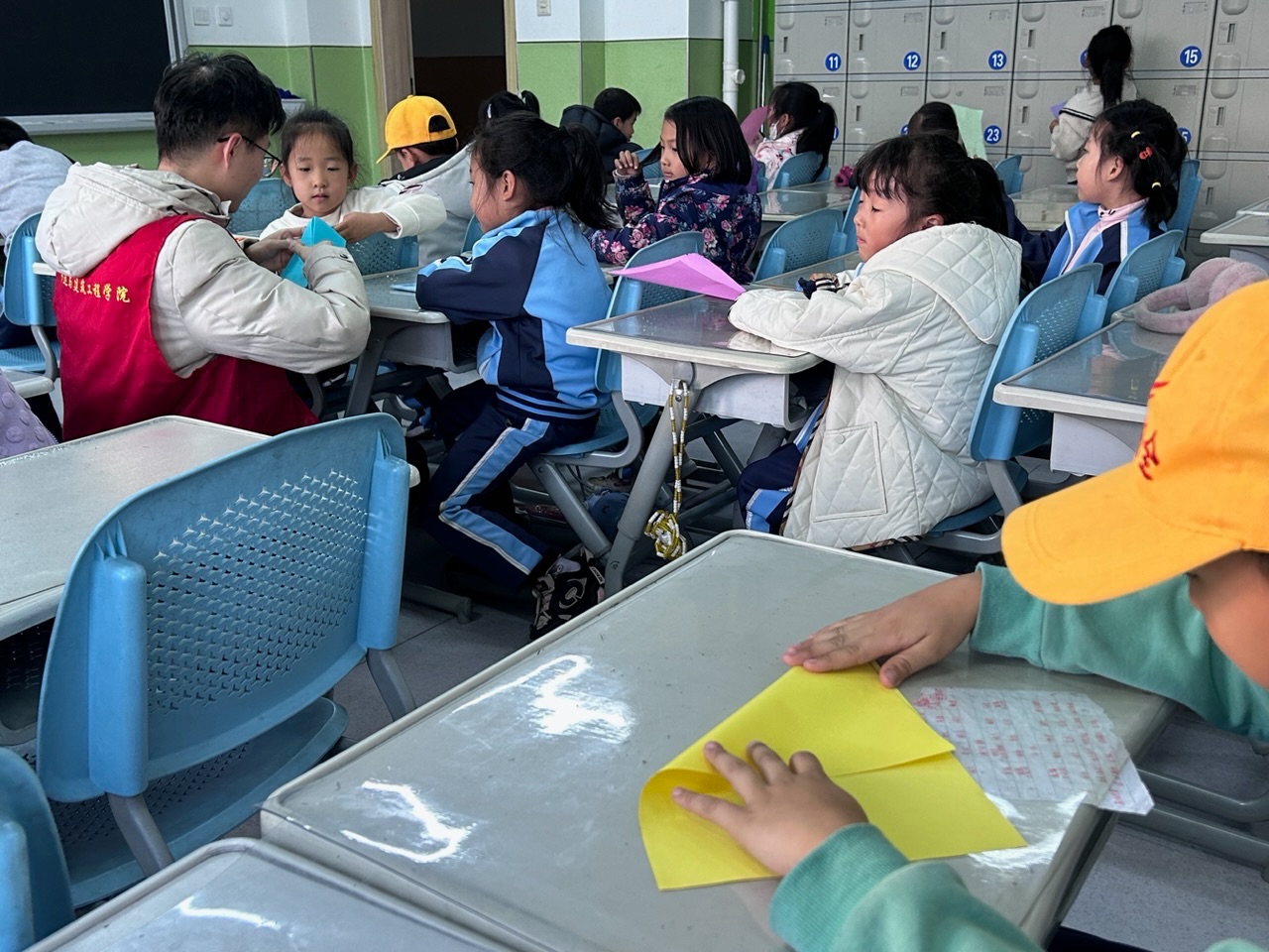接着,进入下一个活动,用卡纸折出鱼的形状。一位队员在讲台上示范,另外两名队员随时协助有困难的小同学。在大家的共同努力下,一只只五颜六色的小纸鱼被创造出来。放学铃声响起后,召旭服务队与孩子们一起收拾教室,然后孩子们都带上了小黄帽在走廊里有序排队等待着老师,许多小朋友向召旭服务队队员挥手道别。
