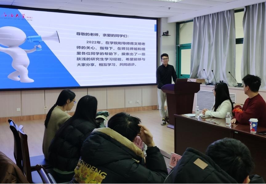会议伊始,博士研究生刘杨介绍了自己的研究课题以及参加的科研项目、科技竞赛等情况,鼓励师弟师妹们要勇于尝试,并以自己的经历为例建议同学们读研期间要全面发展。最后,刘杨向同学们分享了自己论文写作方面的经验,强调论文高质量配图的重要性。