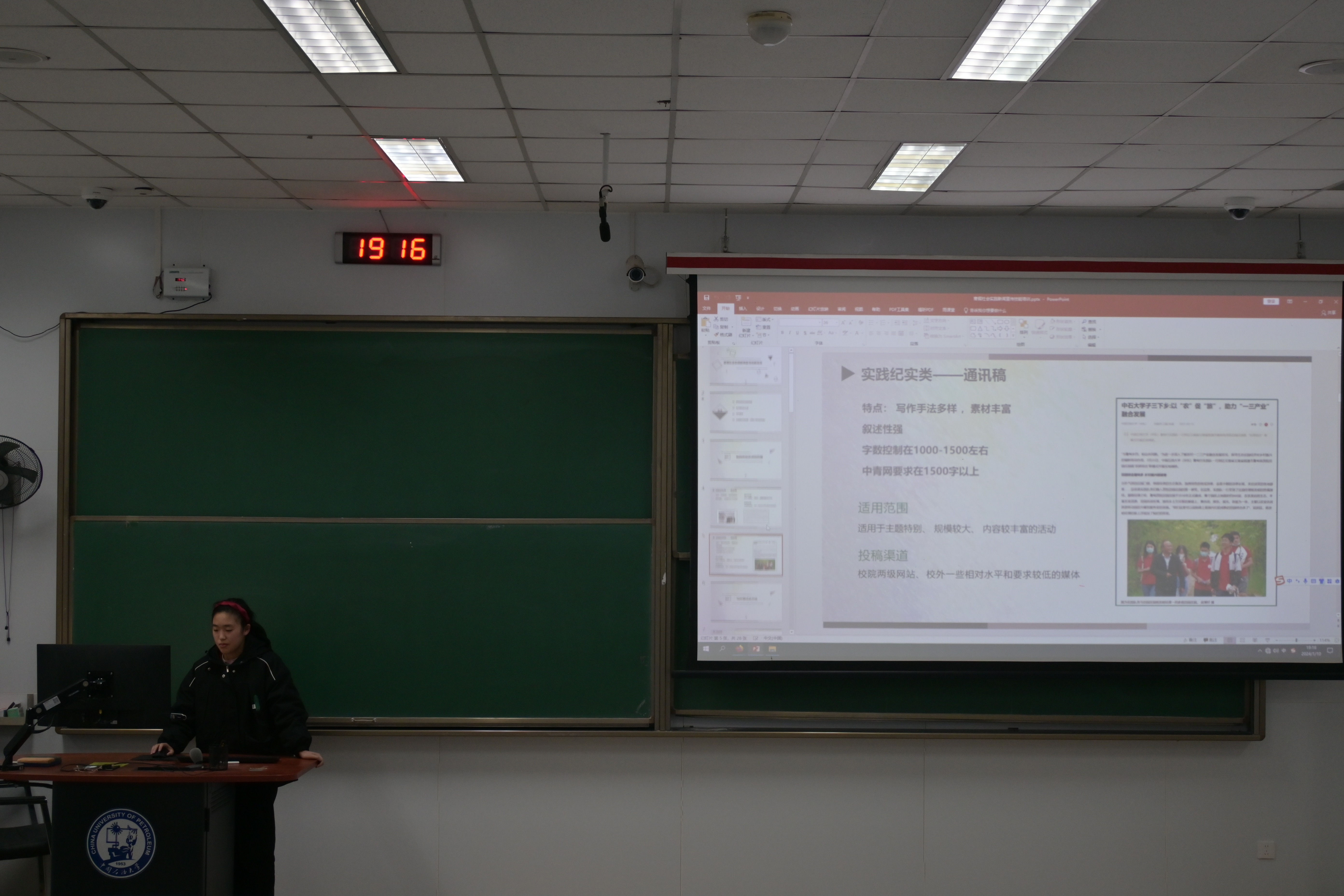 余鑫定从新闻类别讲起,介绍新闻写作的要求和规范,以新闻稿实例详细讲解了新闻稿写作时的技巧和注意点,带领各实践队熟悉新闻稿写作模式。余鑫定列举说明主要宣传平台的投稿方式,强调新闻宣传的注意事项,切实提高了各实践队新闻宣传的积极性,为其提供了清晰明确的投稿流程。