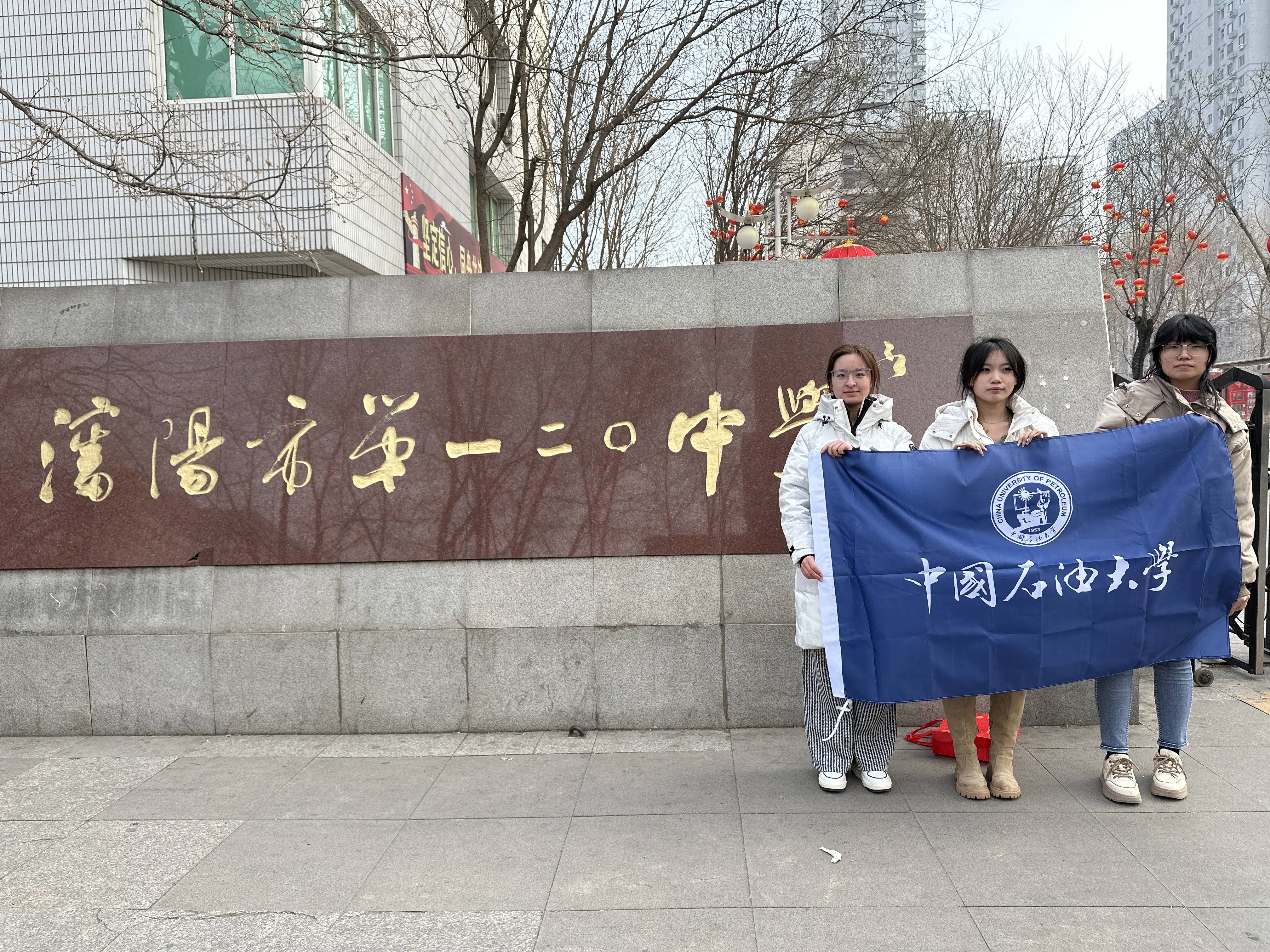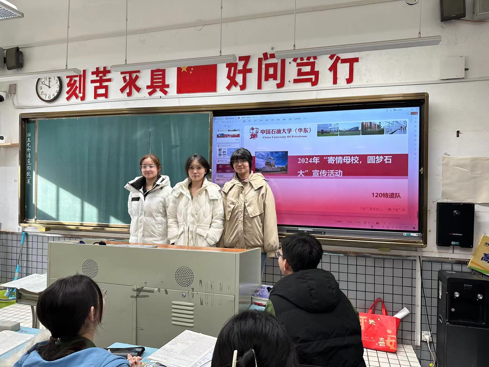活动开始前,团队成员与高中负责人取得联系,确定了入校时间、宣传年级与宣讲班级。活动伊始,成员们进入高二16班分发招生手册,对同学们进行详细的招生宣讲。主讲人邱玉婷从建校背景、公司环境、校内资源、辽宁省录取分数线等多方面向同学们介绍石大。接着,张可欣和于佳琪分享自己的高中学习经验和老员工活,并对同学们提出的问题进行解答,留下意向生源的联系方式,与同学们留影纪念。最后,团队成员前往高三楼,在校内公示板共同张贴招生海报,为高三同学提供报考建议。