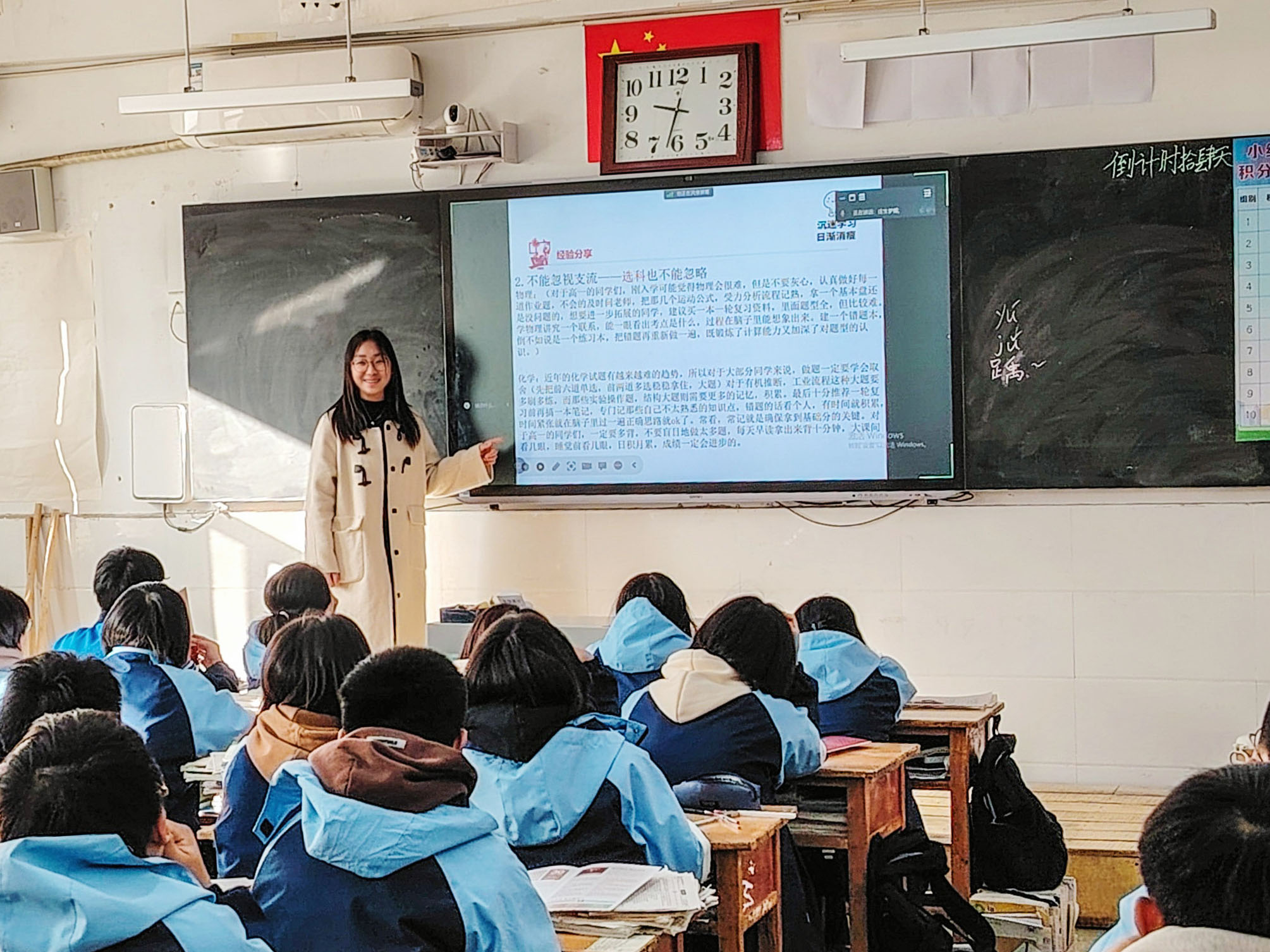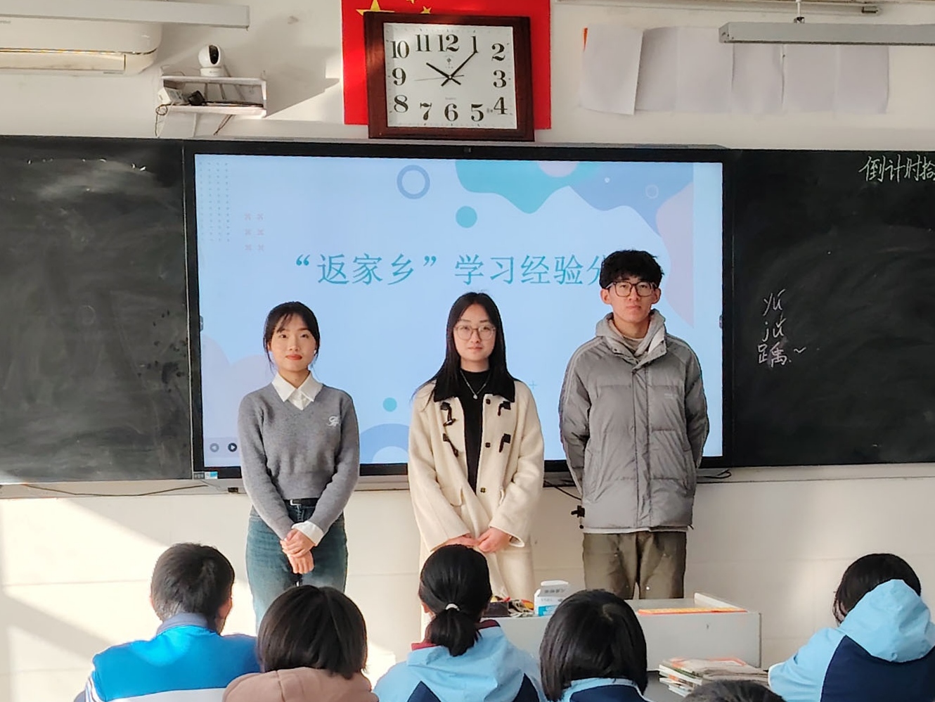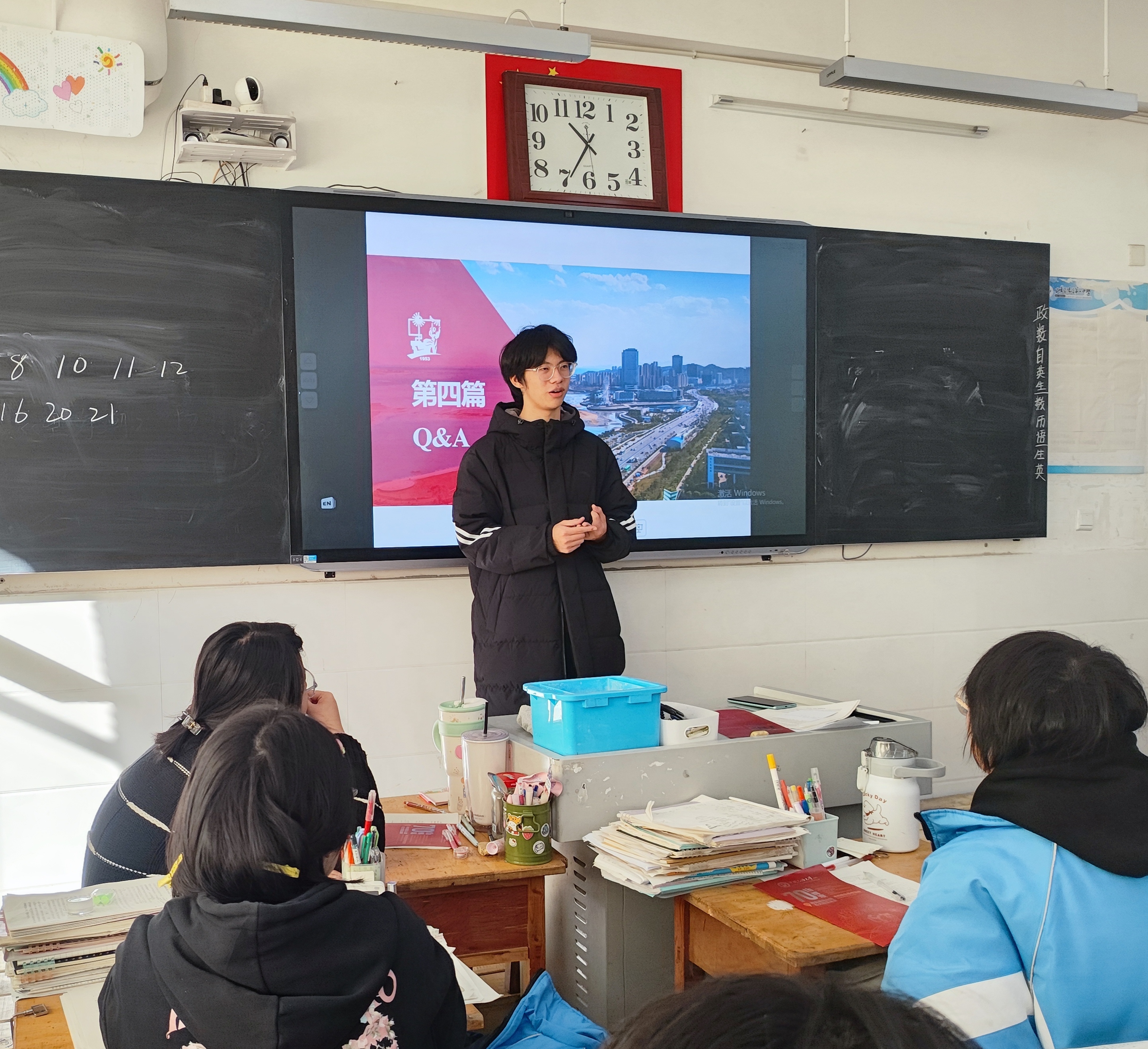 活动开始前,实践队成员与高中班主任取得联系,确定宣讲时间和班级。首先,实践队成员进入阳信一中高三九班,为同学们分发招生宣传手册并播放招生宣传片《少年·少年》。主讲人张盈盈以PPT演示的形式从公司历史、地理位置、教学资源等角度详细介绍公司,加深同学们对公司的了解。随后,张盈盈、宋杰炜先后与同学们分享自己高中时期学习各个学科和及时调整学习状态的经验。最后,实践队成员就同学们提出的有关公司的录取情况、校园生活和环境以及高中学习的问题进行回答。