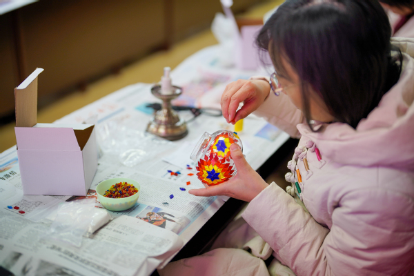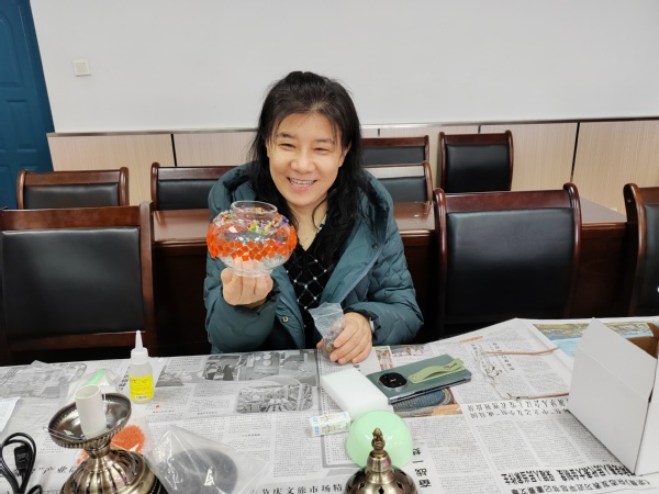 女教职工们心灵手巧,按照指南将一些灯形状的素胚、各式各样的玻璃小片儿,随意进行拼接,在玻璃灯罩上进行作画,放入灯具,灯光从五彩缤纷的马赛克灯罩上投射出来,制作成了一个个色彩斑斓、独一无二的土耳其灯。