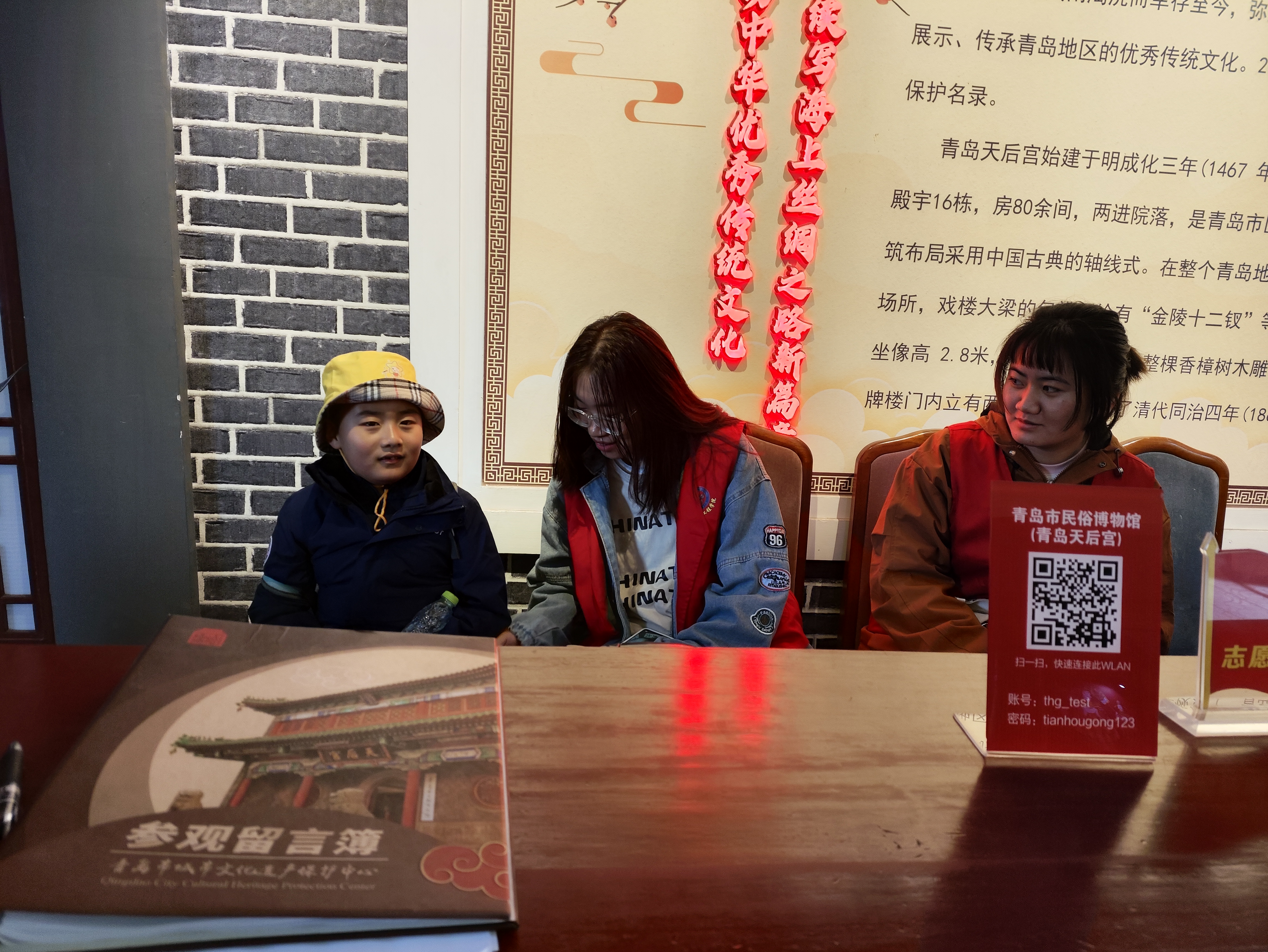 周六的天后宫格外热闹,许多小朋友来到天后宫参观游览,争相成为”小小解说员”。在小朋友们的队伍解散时,因为家长没有及时接走孩子,带队老师便让孩子与志愿者们互动交流。志愿者积极与孩子们沟通,让孩子们在等待的过程中没有体会到孤独,志愿者们也从孩子身上获得了快乐与幸福。在本次志愿服务中,志愿者们也参观了天后宫,领略其中的历史底蕴,并学习到青岛民俗相关的知识,如筷、箸、年画、剪纸等。