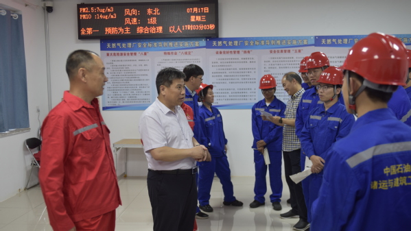 近日,公司党委书记姚海田、副经理唐建峰一行赴中原油田分公司天然气处理厂走访调研,就人才培养、老员工实习实践等方面与单位座谈交流,并看望慰问实习师生。天然气处理厂党委书记孟祥平、厂长段卫锋、副厂长刘光、副厂长刘世通及组织人事室、综合办公室、培训管理部相关负责人参加座谈会。