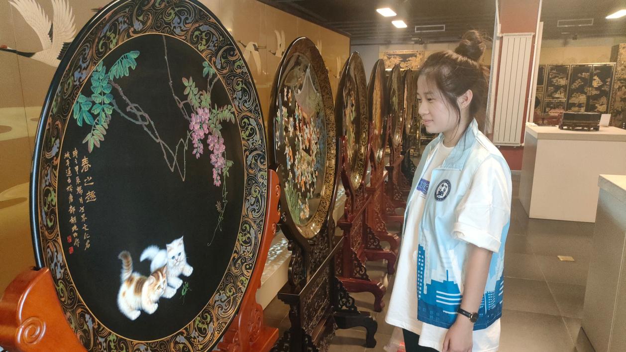 在刘煜老师的引领下,实践队员们首先参观了漆器制作的车间,亲眼目睹了漆器从原材料到成品的完整制作流程。车间内,工匠们全神贯注于打磨、推光、髹饰等工序。实践队员在制作工艺展示区,领略了丰富多样的推光漆器作品,包括传统的漆画、立体漆器,符合现代审美的手镯、耳饰等。