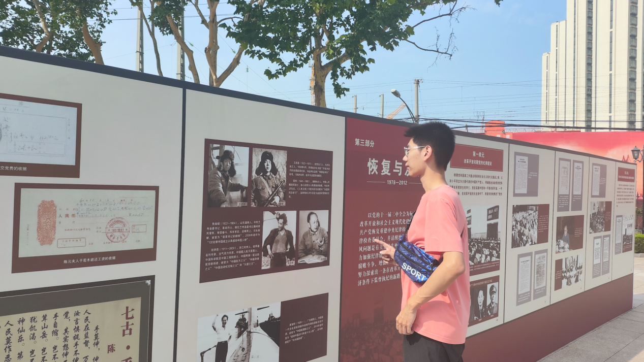 随后,纪祯和与傅润桐继续参观展馆中“从中国共产党成立到改革开放”的部分,馆内陈列的陈旧的文物、照片向实践队员展示了当时革命的残酷,讲述了新中国成立初期处于探索阶段的艰难。讲解员说:“这世间没有一帆风顺的事业,一切成功都是在曲折之中进行的。”两位成员不禁肃然起敬。