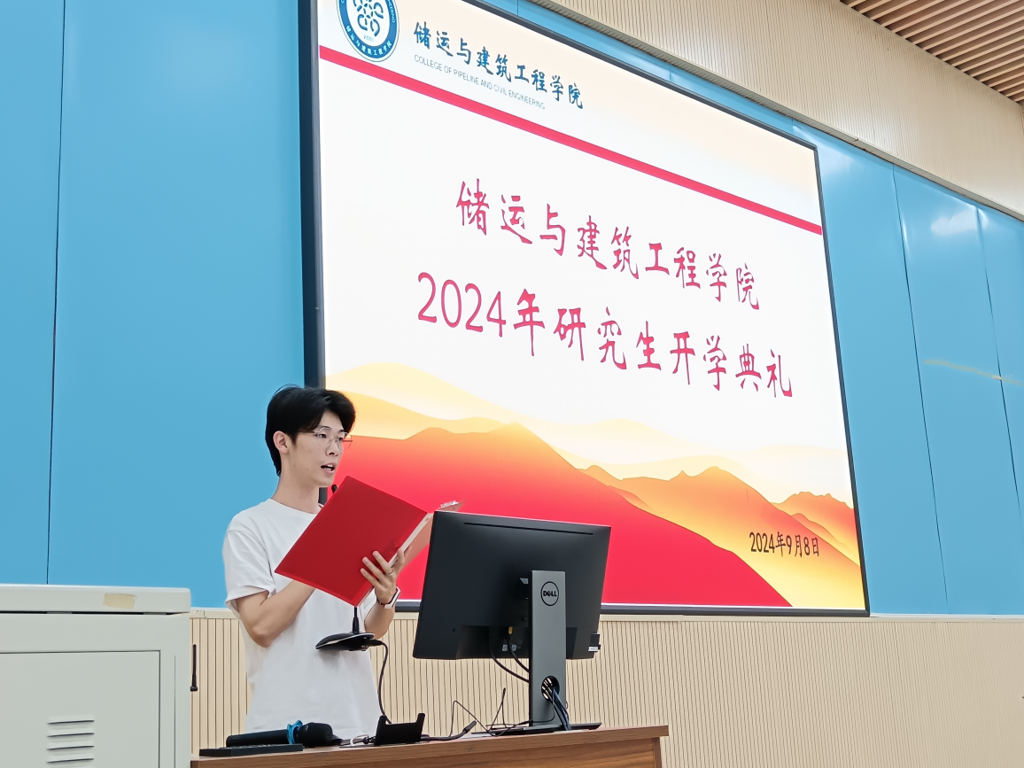 新生代表、石油与天然气工程专业2024级硕士研究生石永琪分享了自己在面对即将开始的研究生生活的几点思考与期待。他表示在未来的日子里将会珍惜每一次课堂上的讨论,勇敢迎接挑战,敢于突破自我,学会与他人协同工作,在学术的道路上不断前行,取得更大的进步。他祝愿每一位同学不仅在学术上取得优异成绩,更在人格修养、社会责任感等方面得到全面提升。