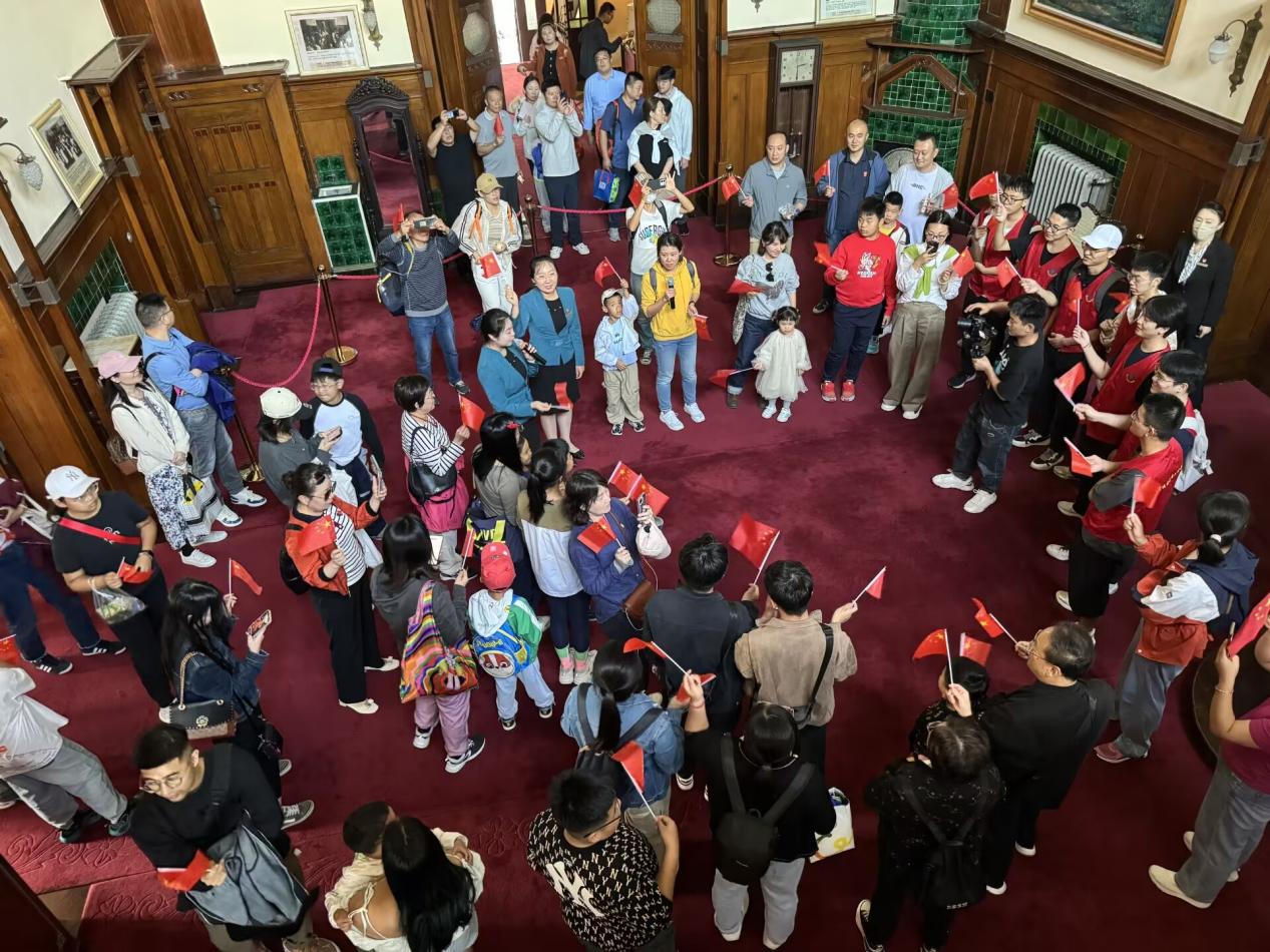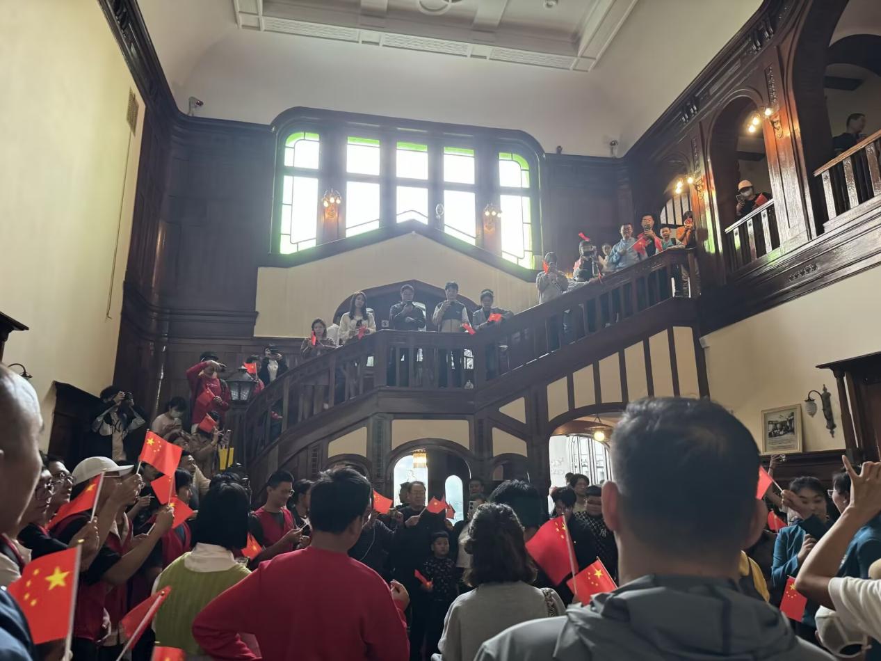 活动当天,青岛德国总督楼旧址博物馆内人头攒动,游客们被这场快闪活动深深吸引。志愿者们身着统一服装,精神饱满地站立在博物馆中央大厅。随着音乐声响起,志愿者和游客齐声唱响《如愿》。歌声悠扬,情感真挚。在场的人们不仅感受到了浓厚欢快的节日氛围,也油然生发出对祖国的热爱和自豪感。