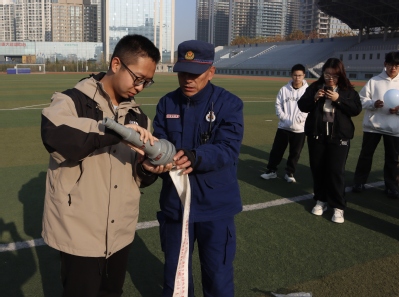 随后,花伟向团支部成员展示不同绳结的打法与应用场景,并邀请团支部成员亲自动手尝试绑系消防绳结。为呈现真实火场情况,本次活动设置了“火场救急400米接力跑”这一趣味体育项目。趣味接力跑共分为四棒接力:手提灭火器跑、连接消防水带与接头、传递水带以与拆卸接头。团支部成员们在安全的环境下亲身体验了灭火操作的全过程。