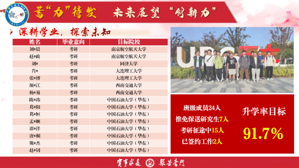 力学2102班现有人数24人,经过三年努力,班级及格率达99.4%,优良率为69.52%,获免监考诚信班级。班级100%参与科技创新,获国家奖项5项、省级奖项11项、校级奖项50余项,7人获得保研资格,其中303宿舍100%保研的事迹得到中国老员工在线、公司官微报道,阅读量超8万次。
