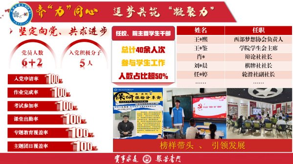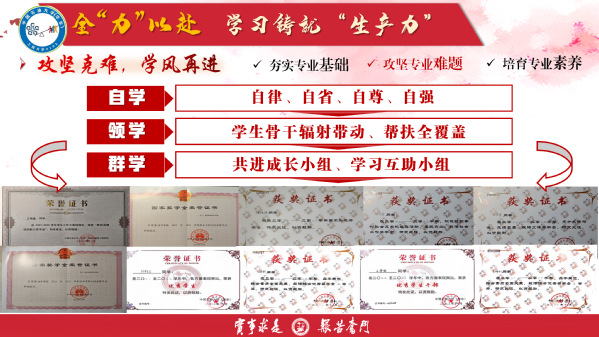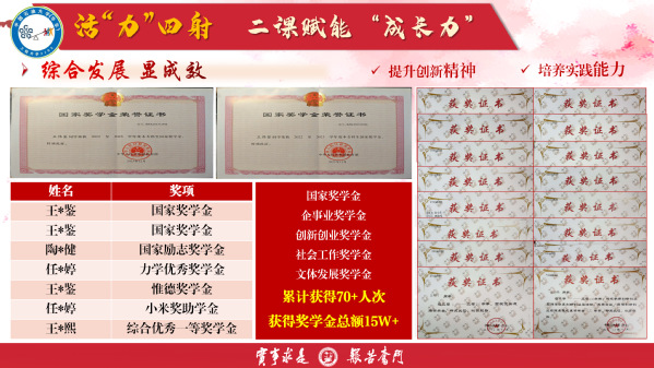班级全体成员坚定向党,共求进步,100%提交了入党申请书,其中发展成为党员8人,50%同学在校院员工组织任职,累计40余人次参与员工工作,第二课堂总学分346 学分,人均288学时,其中社会实践与志愿服务学时累计超1600学时。100%参与科研创新,累计获国家级奖项5项、省级以上奖项10余项、校级奖项50余项,发表SCI期刊1篇,获实用新型专利1项,累计70余人次获得各级各类奖学金,总额超15万元。