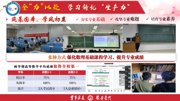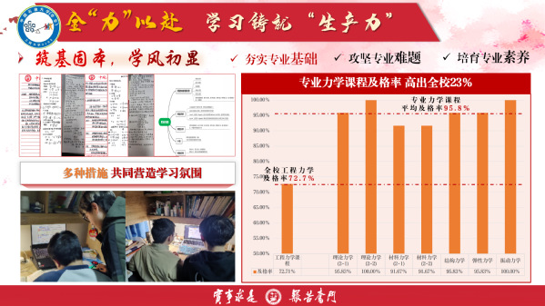 在班主任王海静、学业导师李玉坤的悉心指导下,班级凝聚起“培养具有良好数学、物理、计算机等方面的基础知识,扎实完备的力学专业知识,实践与创新能力强,具有国际视野,能从事科学研究、研发设计等方面工作的高素质工程力学专业技术人才”的目标共识,聚焦克服专业课程难度大、不及格率高、课程优良率低等挑战,建立了“3 + 3”学风机制,即党员牵头成立“共进成长小组”“学习互助小组”等三个学习组织,发挥自学自主性、领学共同性、群学互补性,同时制定三项监督措施并提供学习交流平台,形成了独特的学业促进模式。入学以来,他们借助“储学堂”等平台开展小课堂,高数期中考试连续两次排名全校第一。班级内部推行“对点帮扶、同寝同进”学习制度,组织“学霸笔记分享”“好题错题分享”等活动。