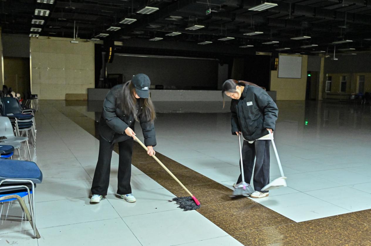 活动伊始,唐岛湾部长陆艺萱对本次校内卫生工作进行了详细分工。队员们被分为两组,一组负责扫地,一组负责拖地。队员们分工明确,配合默契,他们以饱满的热情和严谨的态度,挥动手中的扫帚和拖把,“地毯式”清理纸张碎屑,“无死角”拖洗地板污渍。在活动的最后,唐岛湾部长陆艺萱集合全体队员对活动厅散乱桌椅进行整理。经过志愿者们半个多小时的辛勤劳动,唐岛湾活动厅整洁如新。