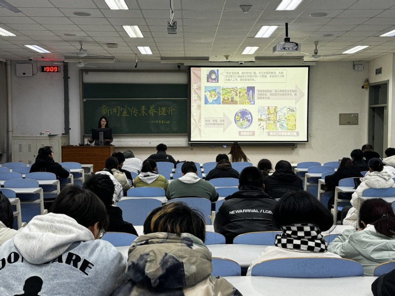 赵定钰对会议类新闻稿的写作特点与结构进行讲解。她指出标题不仅要合理提炼会议讲话的内容,还要能够吸引读者的注意力。她进一步阐述了新闻稿中语句和段落间逻辑清晰、结构严谨的必要性,指出新闻结尾应总结会议的核心意义,强化新闻的深度和影响力。她指出新闻中不得出现事实性错误,语句应简洁有力,语言应生动形象,以增强新闻的吸引力和传播效果。手绘技能和美工能力培养方面,赵定钰详细介绍了相关学习方法,推荐了常用的绘画软件SAI2,她建议同学们选择性地利用AI等智能工具来提升工作效率,可以通过多欣赏优秀作品并积累构图经验,逐步提高设计水平。