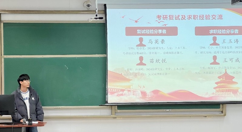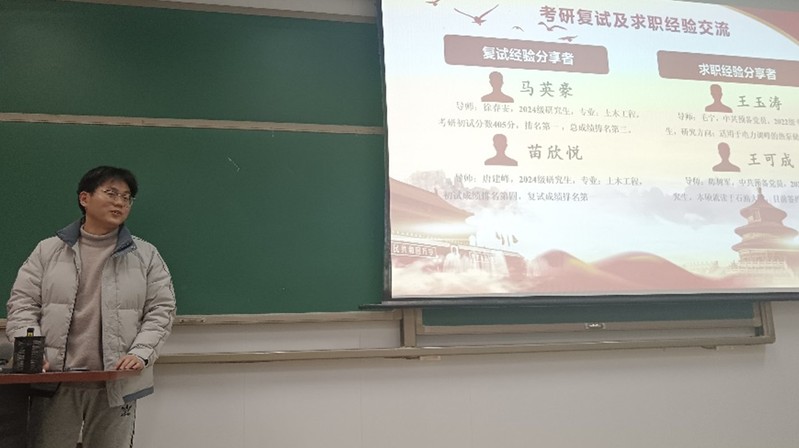 为帮助本科生更好地应对考研复试和求职,2024年12月26日晚,研究生建环第一党支部、研究生建环第二党支部、本科生建环党支部共同在南堂115教室成功举办了考研复试及求职经验分享交流会。