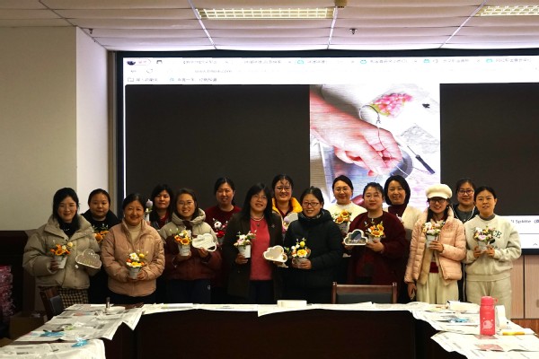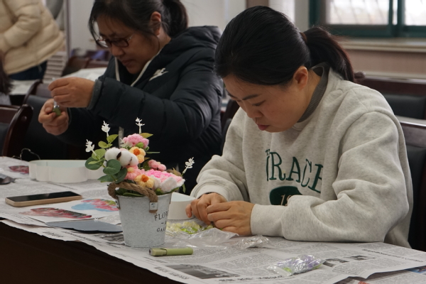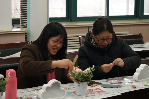 工科楼D座的活动现场花团锦簇,笑声不断,女教职工们心灵手巧,将一颗颗晶莹的花朵和水晶石粘贴成漂亮的形状,放入灯具,在镜子的相互反射下,形成了一片无边无际的美丽花海。毛线编织成的美丽花朵在女教师的手中搭配成色彩斑斓、独具匠心的花艺作品。两个小时沉浸式的艺术创作,让大家真切感受到了节日的快乐。