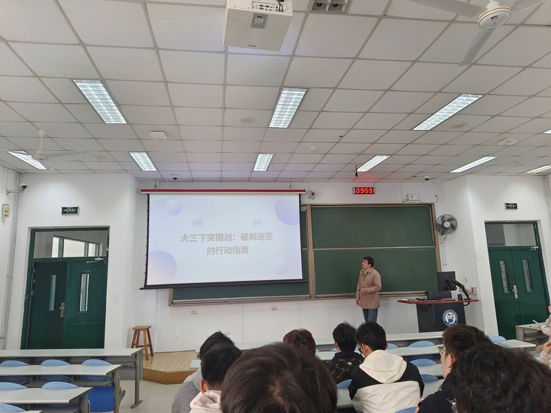 在班会中,陈树军以麦可思研究院的调研结果为理论依据,他提到,大三员工面临着考研、就业、考公等多条道路的抉择,存在学业与职业规划的双重压力,具有典型的“选择焦虑” 问题。他针对不同的规划选择给出了不同的建议:准备考研考公要尽早寻找目标院校、课题组或岗位,做好定期定量的规划,针对学习的薄弱环节及时调整和改正;寻找就业机会的同学要时刻关注市场动态、行业信息,避免在纷繁复杂的海量信息中迷失方向。随后,他介绍了SWOT分析法,并建议同学们用其对自我进行解码,挖掘与展现优势,正视与改进劣势,捕捉与把握机会;拉长时间线,为读研或就业做长远打算。