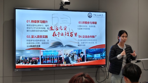 孝睿杰以自身丰富的竞赛经历为切入点,阐述了从初次参赛的探索尝试,到逐渐取得成绩,再到在各类赛事中脱颖而出的成长过程。她的亲身经历让使员工们对创新创业领域有了更为深入和全面的理解。她强调:创新不是空中楼阁,要紧扣'双碳'战略、能源转型等国家重大需求,在解决实际痛点中体现工科生的专业价值。”结合自身三年双创实践,孝睿杰提炼出“创新人才成长四维模型”,一是构建“专业课程+交叉学科”的知识体系,定期研读《Energy》《石油学报》等顶级期刊;二是深化“实验室-竞赛场-产业端”的实践链条,主动参与教师科研项目;三是培育“敢闯会创”的开拓精神,在失败案例中积累经验;四是搭建“导师-学长-队友”支持网络,发挥传帮带作用。在科技创新方面,她建议同学们要持续提升基础理论的学习,深度参与项目实践,积极投身奉献和加强交流合作。