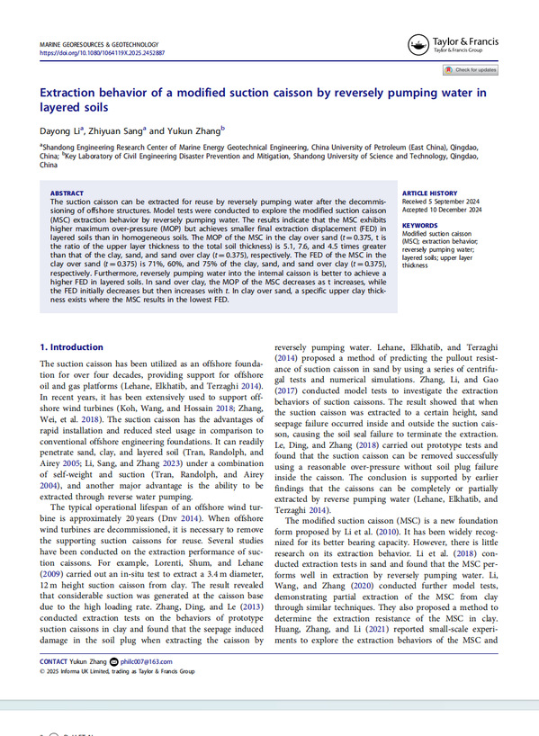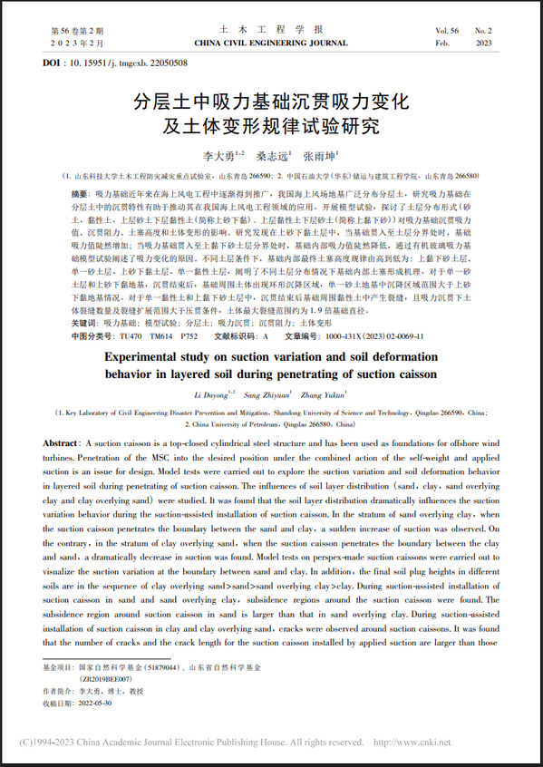 近日,公司李大勇教授团队在海上风电吸力基础锚固安装领域取得新进展,相关研究成果《分层土中吸力基础沉贯吸力变化及土体变形规律试验研究》,《Extraction behavior of a modified suction caisson by reversely pumping water in layered soils》和《Penetration behaviors and soil plug development of suction caisson in sand under applied suction combined with radial vibration》分别发表在《土木工程学报》,《Marine Georesources & Geotechnology》和《Ocean Engineering》。《土木工程学报》是土木工程领域国内顶级EI期刊(卓越期刊),《Marine Georesources & Geotechnology》是海洋工程领域国际著名期刊,《Ocean engineering》是海洋工程领域国际顶级期刊(SCI二区top)。论文第一作者分别为李大勇老师以及博士生桑志远。XC体育为第一,二署名单位。该研究得到了国家自然科学基金面上项目的资助。